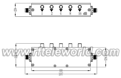 5W SMA variable step attenuator 30db Technical Specifications: NORMINAL IMPENDANCE 50Ω FREQUENCY RANGE DC to 2.5GHz /3Ghz VSWR ≤1.3 POWER RATING 5 watts average Insertion Loss ≤2.5dB TEMPERATURE RANGE -40°C to +70°C Attenuation accuracy Attenuation 1.2.4.8.16dB 1dB Step ±0.8dB 0-10 dB ±1.3dB 10-30 dB